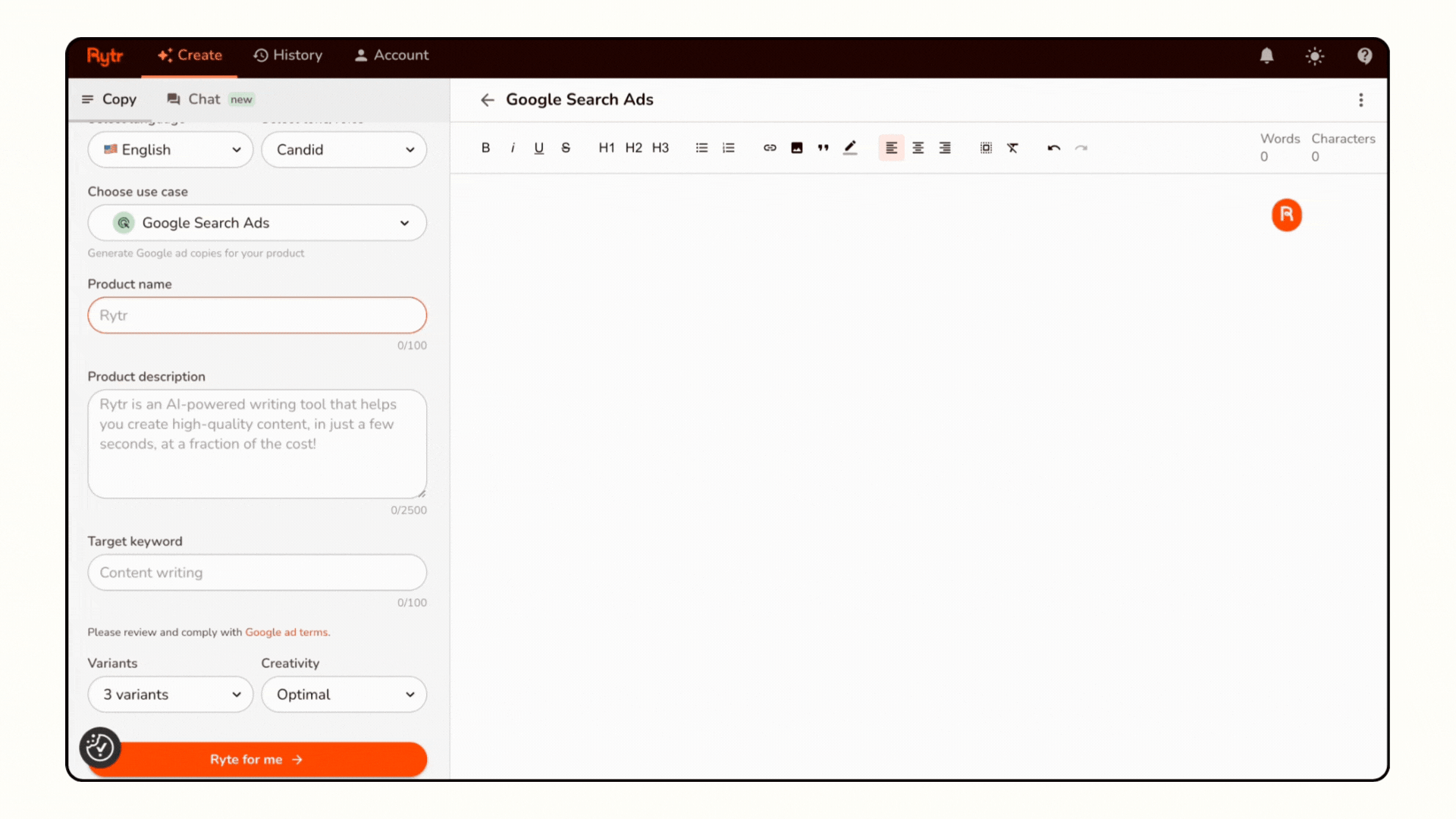 Start by providing a product description, a sentence, or a keyword. Click 'Ryte for me' and watch as our Google Ad Generator crafts compelling ad copy based on your input.